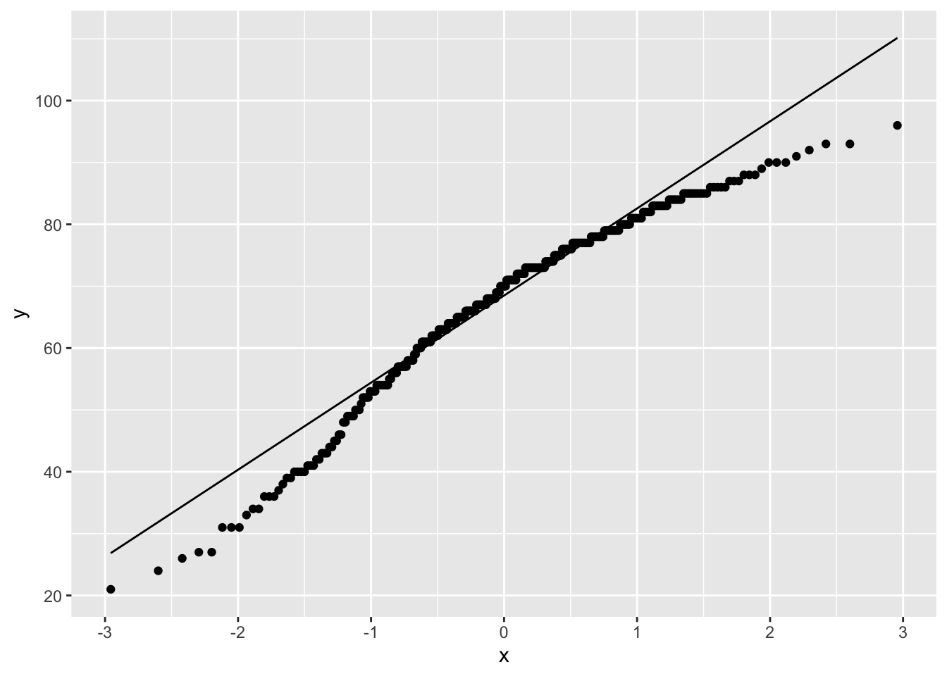 We use stat_qq() and stat_qq_line() methods to plot the QQ plot. Note that here aes takes an argument called sample instead of typical x and/or y.